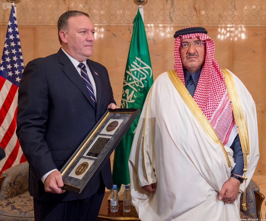 Direktur CIA Mike Pompeo menyerahkan penghargaan “George Tenet” kepada sang putra mahkota di Riyadh pada hari Jumat 10/2/17.