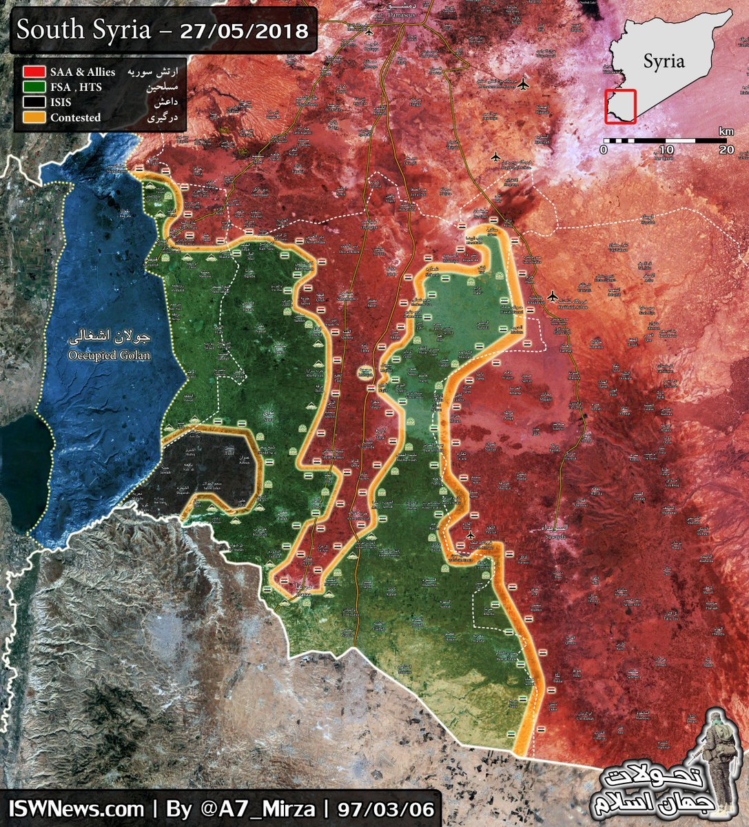 Peta menunjukkan situasi terkini 27/7 di Suraih selatan , Merah area yangsudah direbut kembali Pasukan Suriah, Hijau area yang masih dikuasai pemberontak Suriah, dan Hitam sisa area yang masih dikuasai ISIS. Area biru adalah wilayah Suriah didataran tinggi Golan yang dicaplok Israel.
